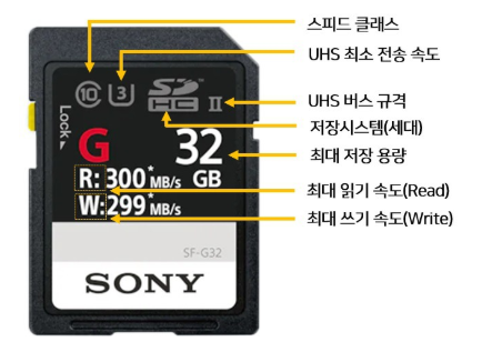 Read(읽기 속도)는 PC, 혹은 카메라가 SD 카드에서 데이터를 읽어 올 때 내는 최대의 속도를 의미합니다. Write(쓰기 속도)는 파일을 저장하는 속도 - 보통 '쓰기 속도'는 SD 카드에 표기된 읽기 속도 보다 낮습니다. 소니의 SF-M, G, TOUGH Series 제품의 경우 읽기/쓰기 속도 모두 표기하지만. 대부분의 SD 메모리 카드에선 읽기 속도만 표기되어 있습니다.