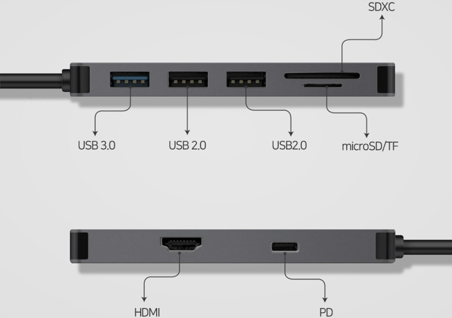 구성은 엄청 단순 합니다. 15cm 정도 길이가 되는 USB C 포트가 선으로 나와 있고 나머지는 USB, HDMI, SD, MicroSD 카드를 꼽을수 있는 멀티 포트 입니다.