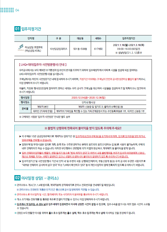 ▶ 입주지정기간 및 사전방문행사 기간내 단지 내 및 주변의 각종 상행위(인테리어, 부동산중개 등)는 우리 공사와 무관한 사항이므로 “대부분 인테리어 공사하여 살고 있다” 또는 “LH에서 묵인하고 있다” 등의 개인사업자의 말에 현혹되지 않도록 유의하시기 바랍니다.