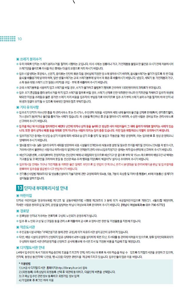 ● 특히, 입주개시 첫 일주일간은 이삿짐 차량이 밀려 단지내부가 매우 혼잡할 뿐만 아니라 입주절차를 밟으시는 데도 많은 시간이 소요되오니 가급적 이면 이때를 피하여 입주하시기 바랍니다.