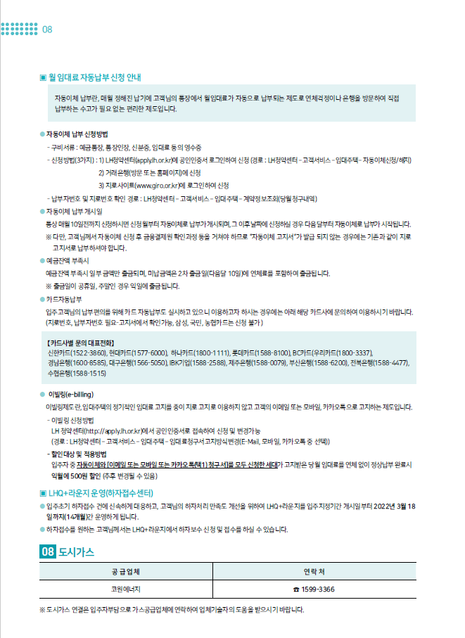 입주자 중 자동이체와 [이메일 또는 모바일 또는 카카오톡(택1) 청구서]를 모두 신청한 세대가 고지받은 당월 임대료를 연체 없이 정상납부 완료시 익월에 500원 할인 (추후 변경될 수 있음)