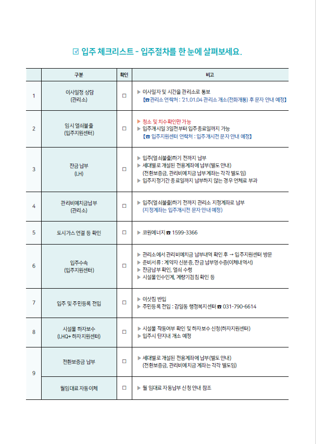 고객님의 가정에 항상 행복이 가득하길 기원합니다. 고객님께서 거주하시게 될 하남감일 A5블록(10년 공공임대리츠)건설공사가 순조롭게 진행되어 2021년 1월 18일부터 입주하게 되었음을 알려드리며, 입주일정ㆍ절차 등에 대하여 안내하오니 내용을 꼼꼼히 확인하시고 준비하셔서 입주에 불편이 없으시길 바랍니다.