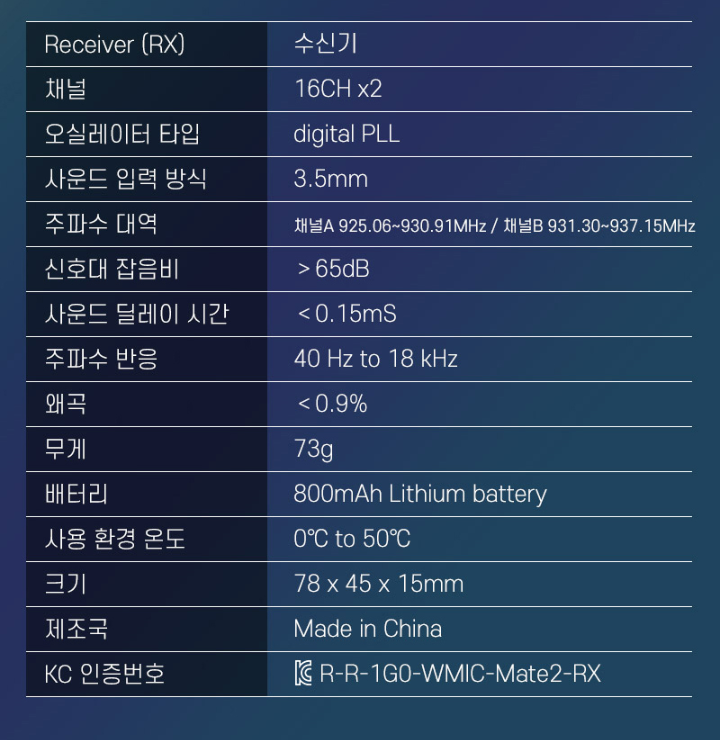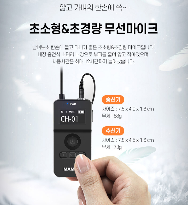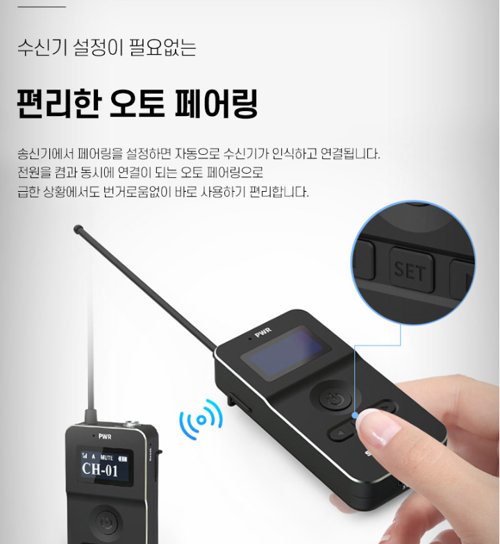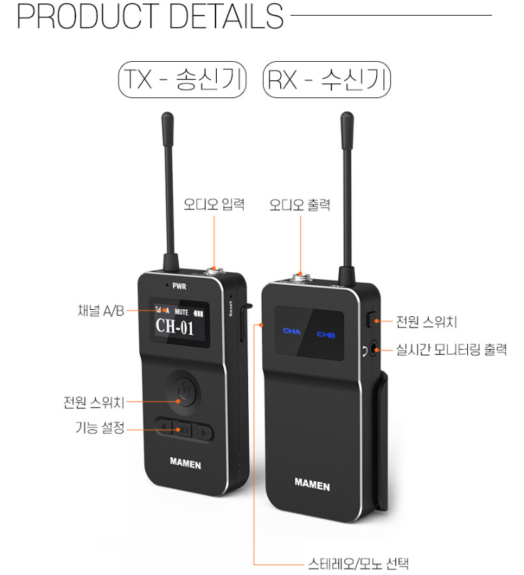 야외 촬영을 할 때는 주변 상황이 어수선한 경우가 많아, 경험이 많지 않으면 멘붕 하는 경우가 많습니다. 늘 그렇듯 현장은 내 뜻대로 되지 않으니까요. 조명과 카메라 세팅만으로도 정신이 없기 때문에 과정 하나라도 간소화시키는 게 아무래도 유리합니다. MAMEN WMIC-MATE2는 전원을 켜면 곧장 연결되는 오토 페어링을 통해 손쉬운 사용이 가능합니다. 송신기에서 페어링을 설정하면 수신기가 자동으로 인식해 서로 연결됩니다.