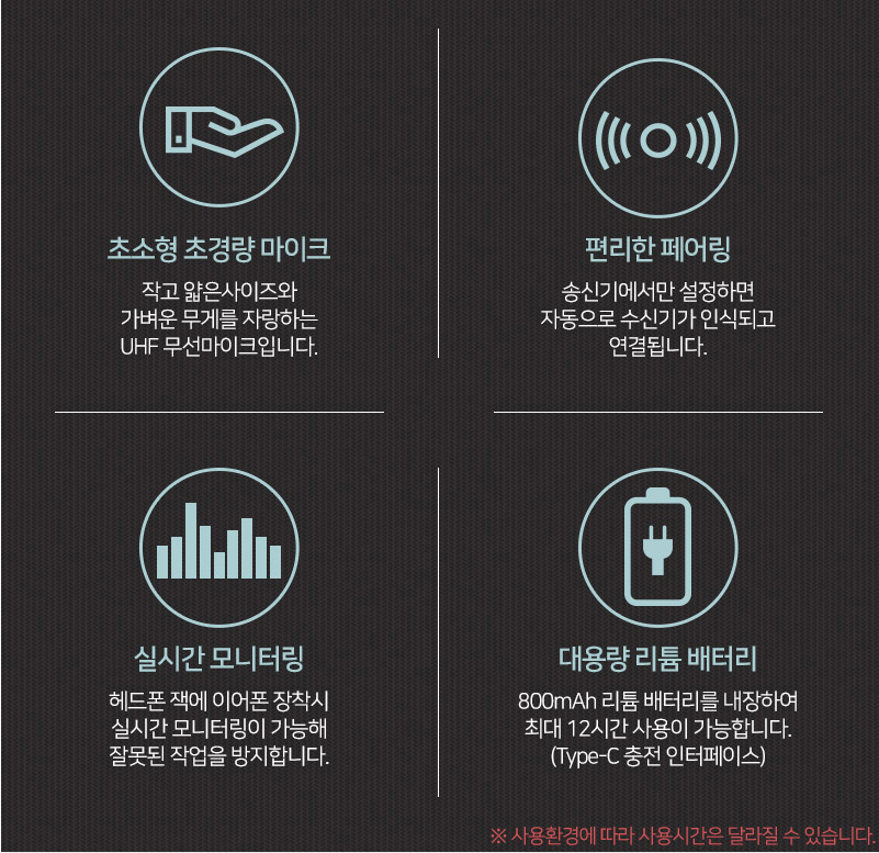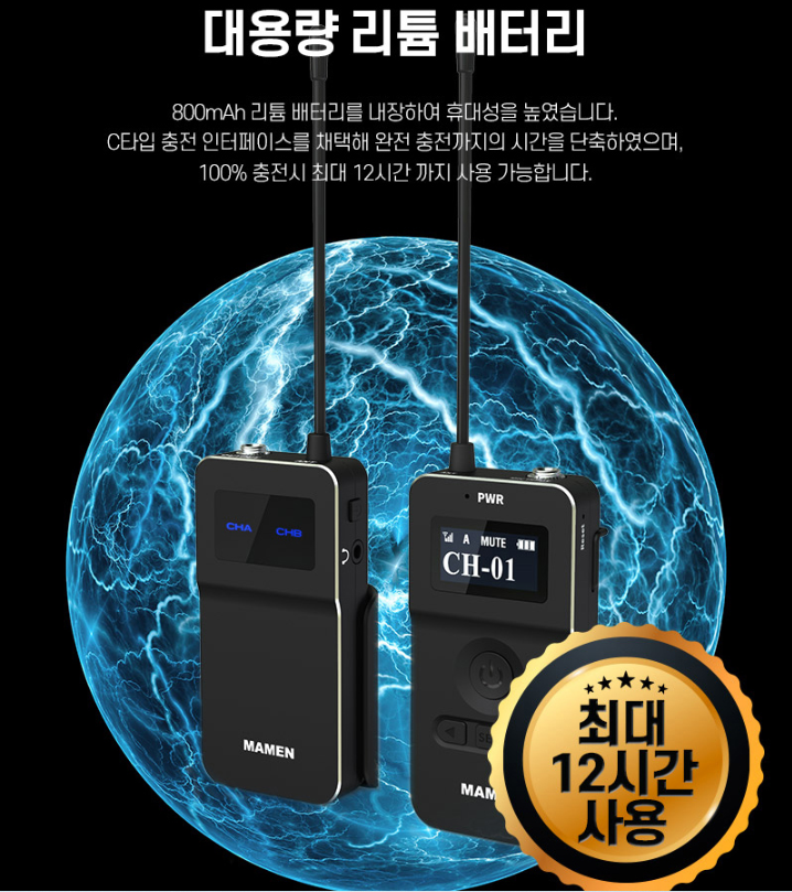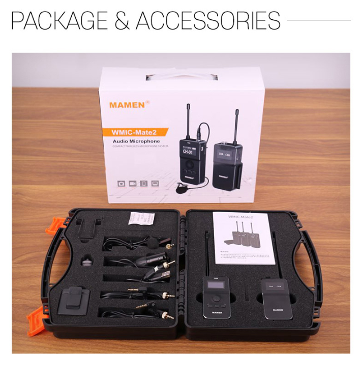 고품질의 내장 칩 채용으로 우수한 사운드를 얻을 수 있습니다. UHF 무선 기술을 적용해 100M의 거리에서도 선명하고 또렷한 녹음을 할 수 있습니다. 직접 녹음한 결과, 내장 마이크와는 비교할 수 없이 깨끗한 사운드를 얻을 수 있었습니다. 디테일을 놓치지 않고 담아내 사운드 퀄리티를 크게 향상시켜줍니다. 카메라 내장 마이크와 MAMEN WMIC-MATE2 마이크의 비교 사운드는 아래 영상을 참고 부탁드립니다.