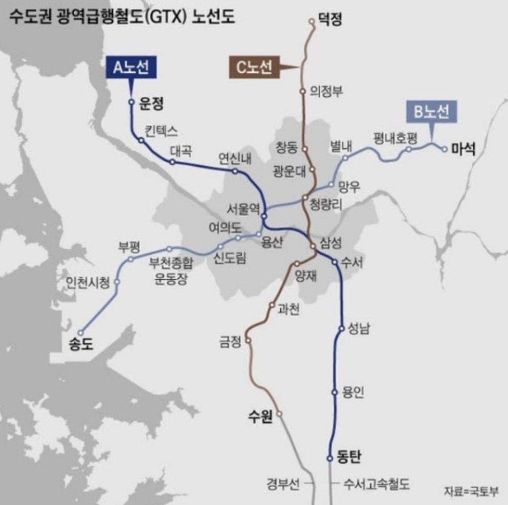 [땅집고] 수도권광역급행철도(GTX) 노선도. /조선DB