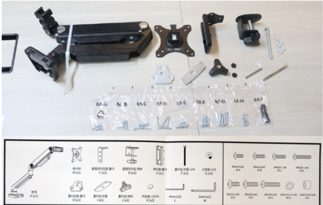 데스크 환경을 고려하여 고정형태를 선택하고 그에 맞는 부품으로 모니터암에 조립하면 됩니다.