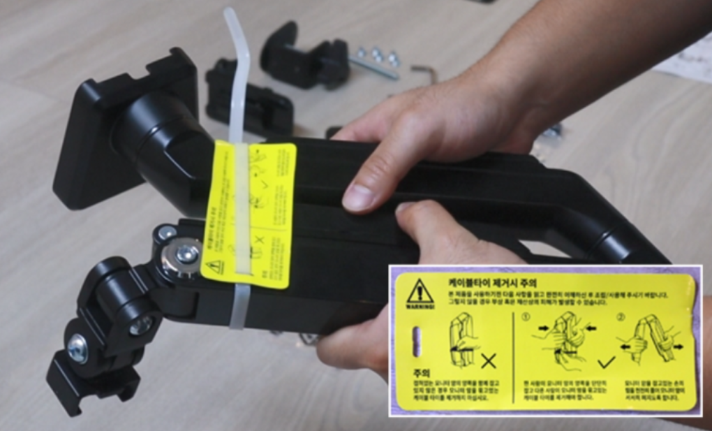 모니터 암은 케이블 타이로 고정되어 있어 케이블 타이를 제거 해야 합니다. 케이블 타이 부분에 주의사항이 붙어 있습니다. 주의 사항 확인 후에 케이블 타이를 제거해야 합니다.