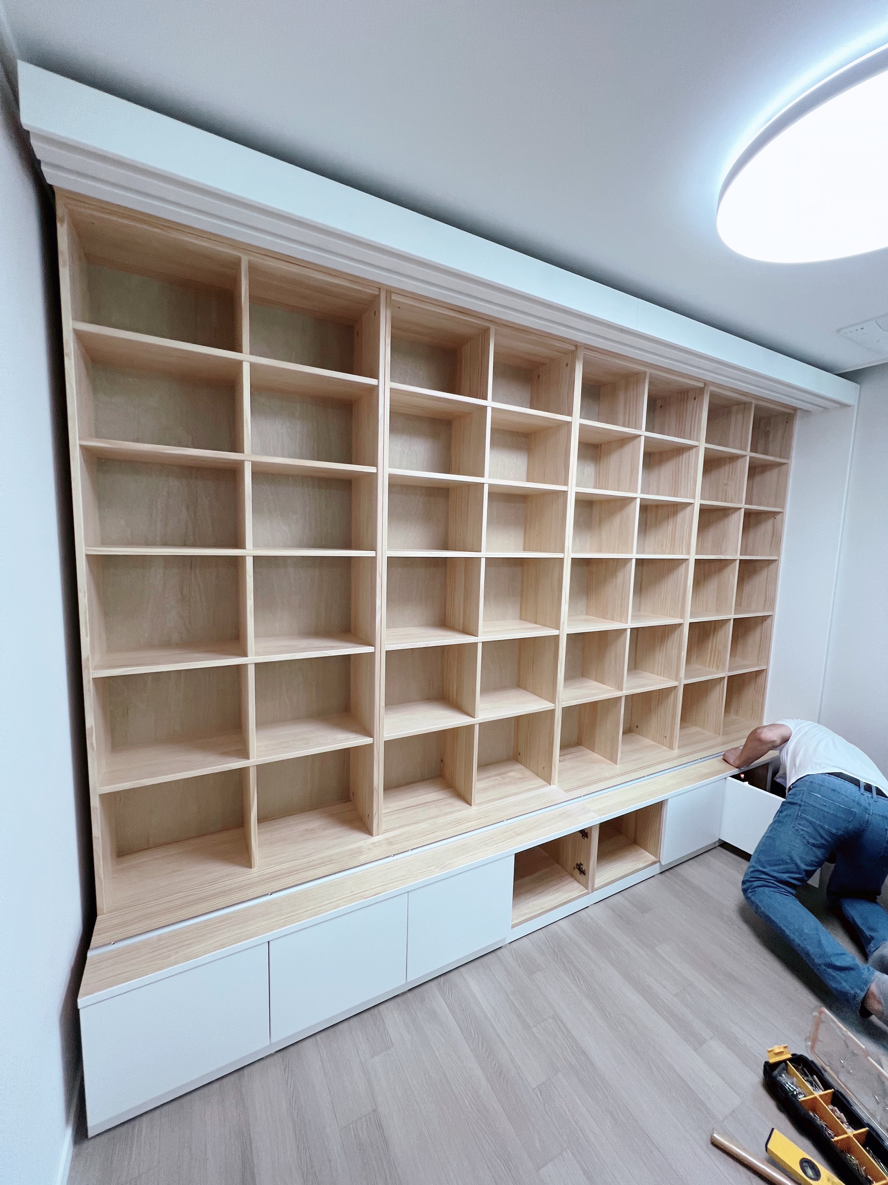 하부장을 놓고 뒷책장 부터 놓습니다 뒤에 책장이 4개가 들어갑니다. 책장 하나당 2×5 칸 이니까 10칸.