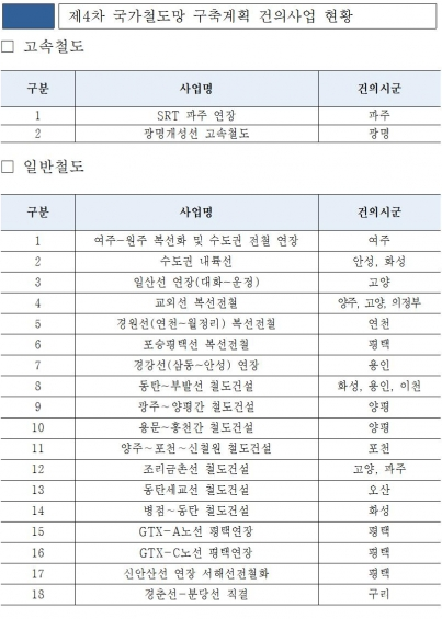 50개 사업 중 GTX-D노선이 5조9천억여원 규모로 단일 사업으로는 최대 비용이 투입될 전망이다. 이어 광명개성선 고속철도 3조5천억여원, 경강선 연장(삼동~안성) 3조3천억여원, 수도권 내륙선 2조5천억여원 등으로 나타났다.
